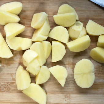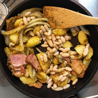 じゃが芋小~中4個の皮を剥き、小さめの一口大にカットします。玉ねぎ 大1/2を薄切り、ベーコン80gを一口大にカットします。煮た白いんげん豆120gの水分を切っておきます。