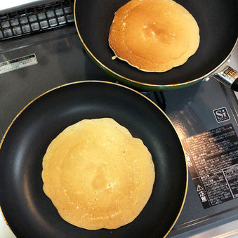 フライパンにオリーブ油(又はココナッツオイル)を入れ中火で温めます。 一旦、火を消した後、生地をお玉一杯フライパンに高い位置から流し入れ、素早くフライパンを回して生地を広げます(半径約17~18cm程度)。 中火で30分焼いた後、プツプツと気泡がで始めたら裏返して裏面を30秒~1分焼きます。