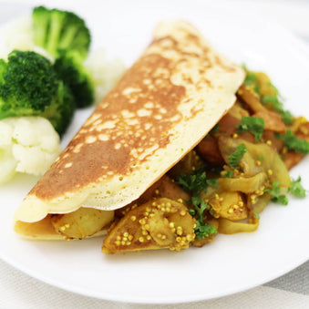 パンケーキはクレープよりも厚く、通常のパンケーキよりも薄く焼くことで、スパイシーな具との相性がとてもよくなります。油を敷いて焼くと、ムラムラとした焼き色がつくことで、カリカリ&しっとりもちもち食感を味わえます。アーモンドミルクを使うことで、よりしっとりコクのある生地になります(アーモンドミルク飲料はNG)。ボリュームたっぷりなので、ディナーにもオススメです。ビールが恋しくなります。チーズを加えてもいいですね。