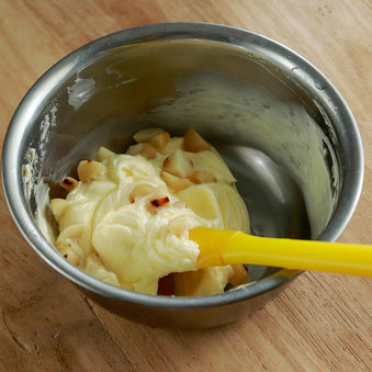 無塩バターをふわふわのホイップバターになるまで練ります。①のローストマカダミアナッツの1/3量を加えて混ぜます。
