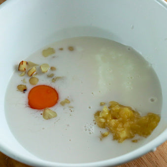ボウルに卵1個、ヨーグルト、ヘーゼルナッツミルクを混ぜ合わせたものに、①のローストマカダミアナッツの1/3量、潰したバナナを加えてよく混ぜます。