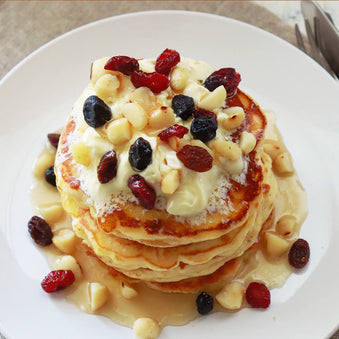 パンケーキを重ね、④マカダミアバターを添え、残りのマカダミアナッツをトッピングしてメープルシロップを掛け、お好みでドライフルーツを飾ります。