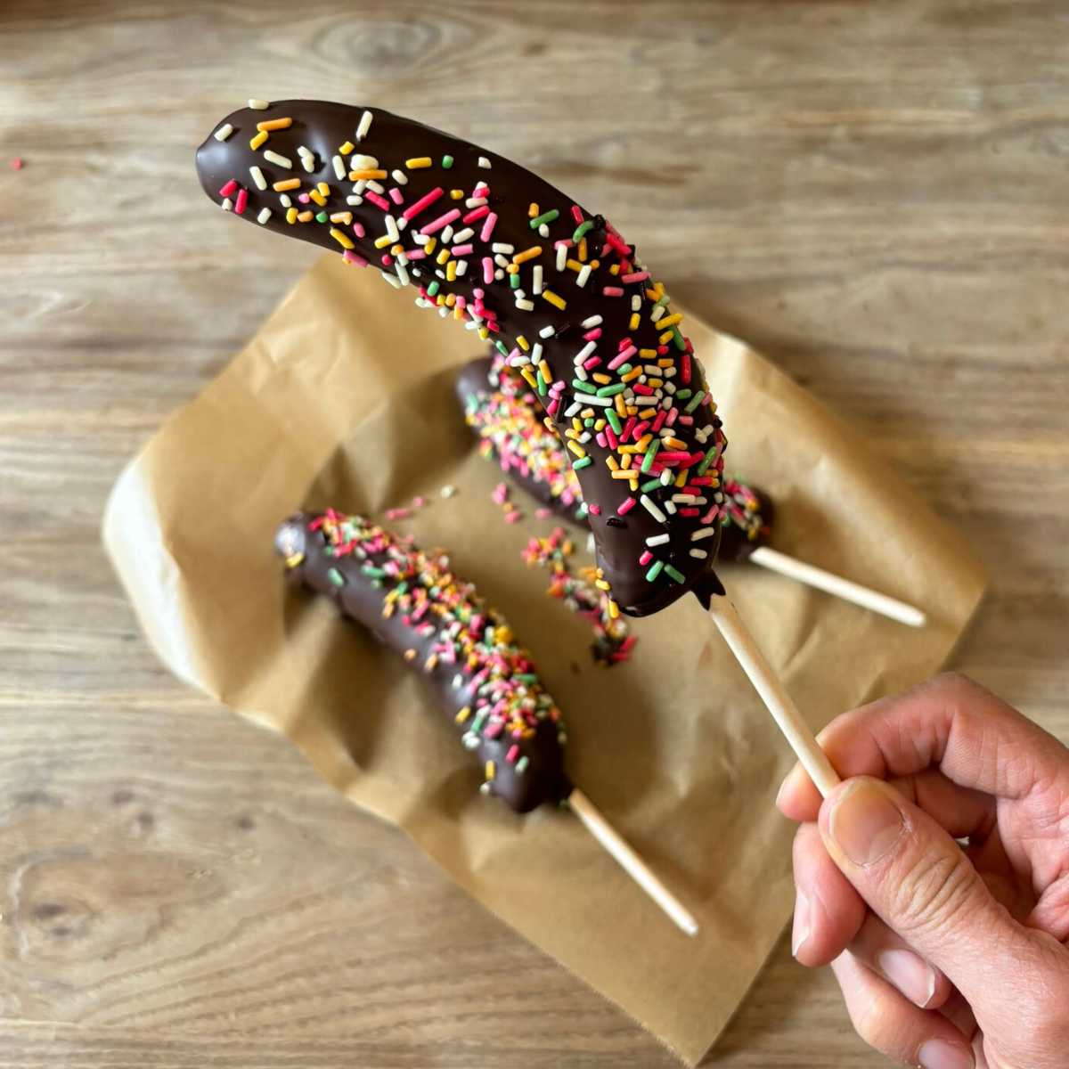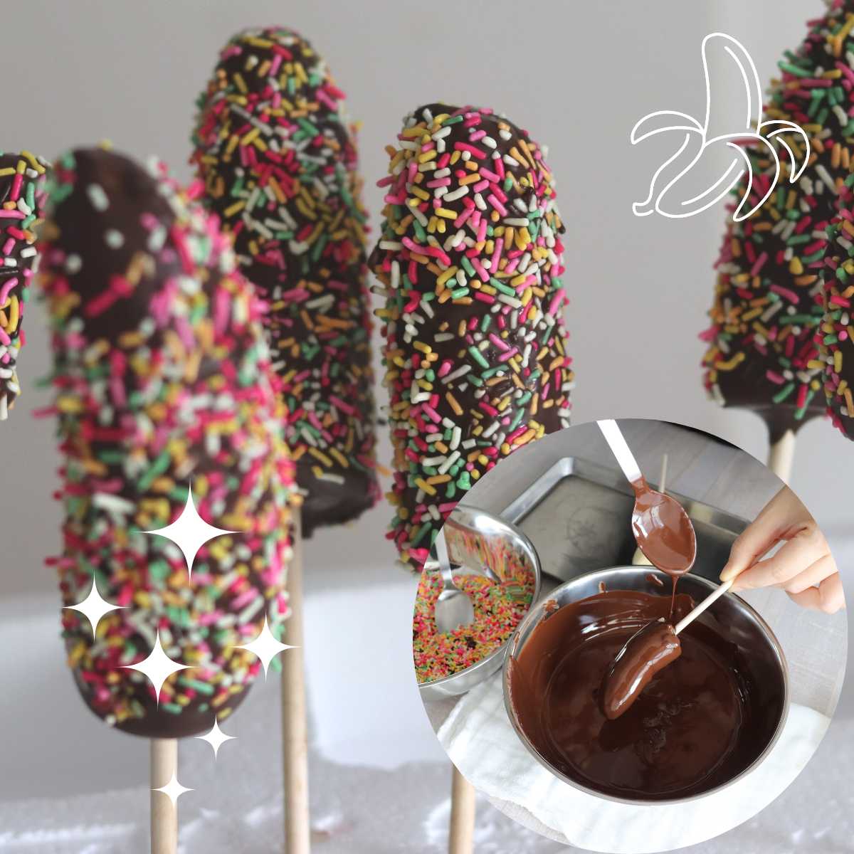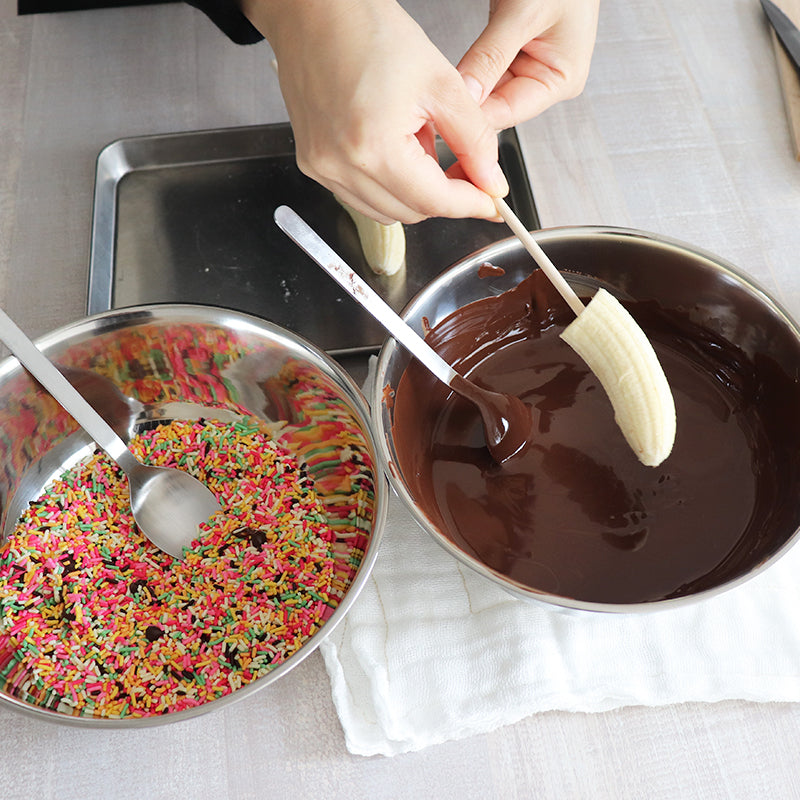 屋台や文化祭でみかけるチョコバナナが簡単にキレイ作れるキューブ状チョコレートを使って、