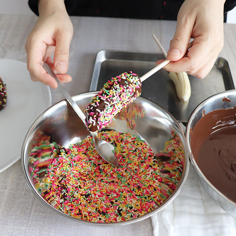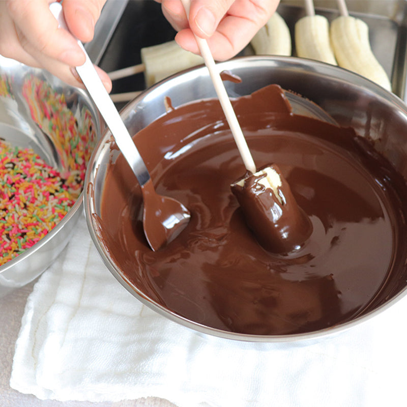 2.チョコ掛けをするときは、棒に刺したバナナの最後部までスプーンなどで丁寧にかけてください。