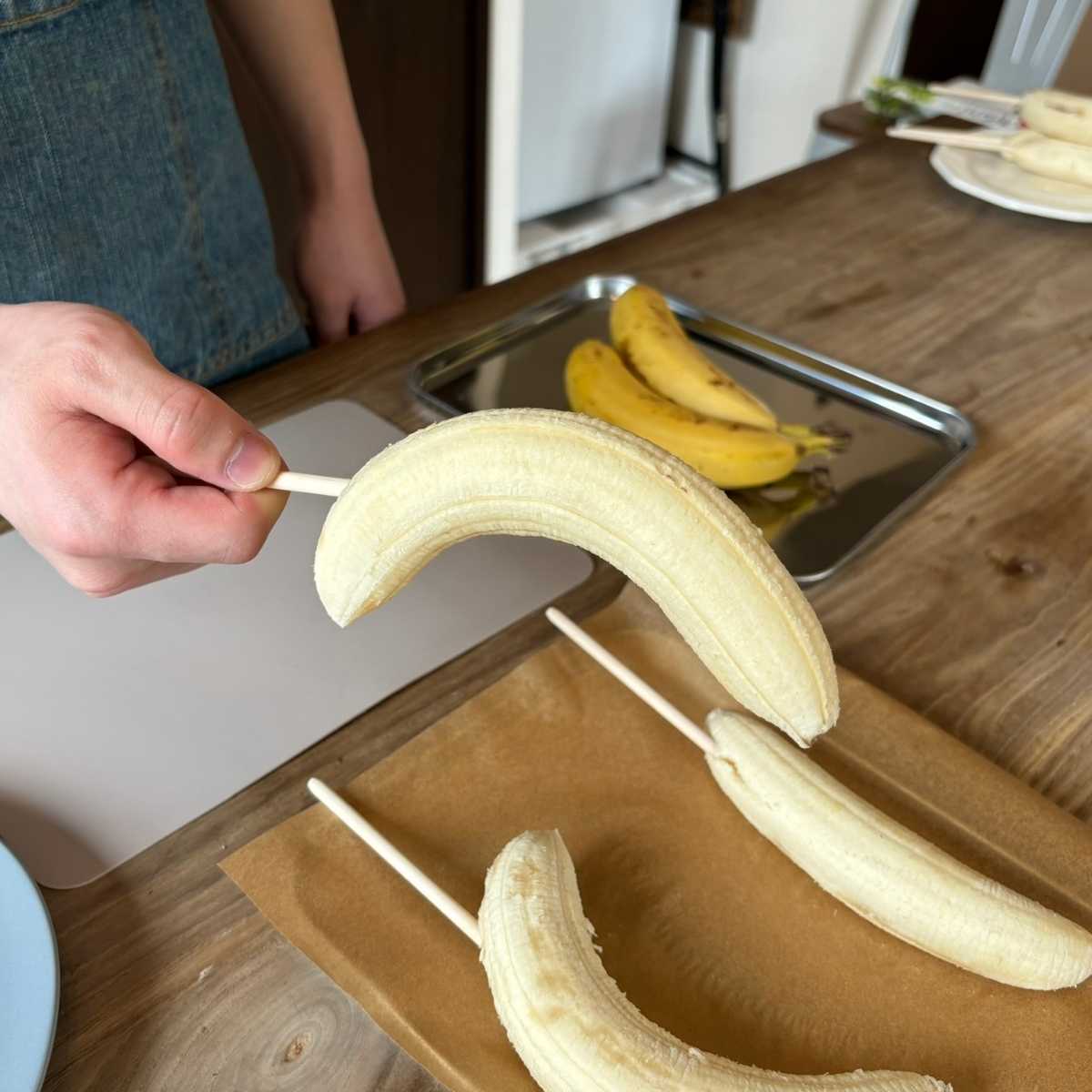 3.バナナの皮をむき、適当なサイズにカットしてから、棒を刺します。